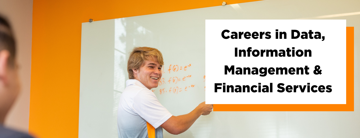 Careers in Data, Information Management, and Financial Services offer opportunities in a variety of environments including healthcare, private corporation, government agencies, financial and banking institutions, consulting firms, and telecommunications. People interested in this cluster of careers often enjoy problem-solving, mathematics, data analysis, computer programming, and systems design. Skills used in this area include, but are not limited to: industry-specific technical skills, problem solving skills, analytical skills, database management, and written/verbal communication. We invite you to explore this cluster to determine if it is a good fit for you and leverage our resources to launch your job, internship, or graduate school search.