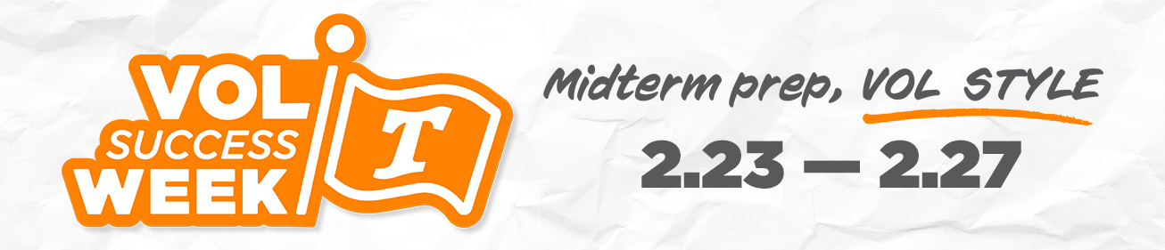 Join us for Vol Success Week, a week-long series of events for students to engage with academic resources to enhance their success and prepare for mid-terms. This semester’s series will be held from February 23-27!